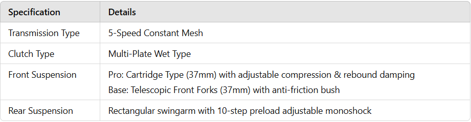 The Hero XPulse 200 4V Pro is a premium adventure motorcycle built for extreme off-road performance. Featuring a 199.6cc oil-cooled, 4-valve engine, it delivers 19.1 Ps of power and 17.35 Nm of torque, ensuring smooth and efficient rides across all terrains. The Pro variant comes with an upgraded long-travel suspension250mm telescopic front forks and a 220mm adjustable rear monoshock, offering superior shock absorption for rough trails.